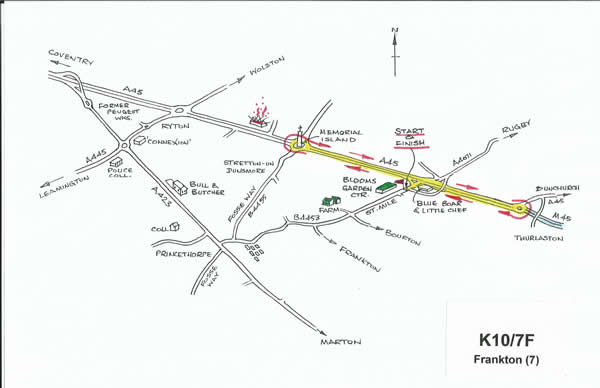 At island at junction with Fosse way encircle island and retrace along A45.